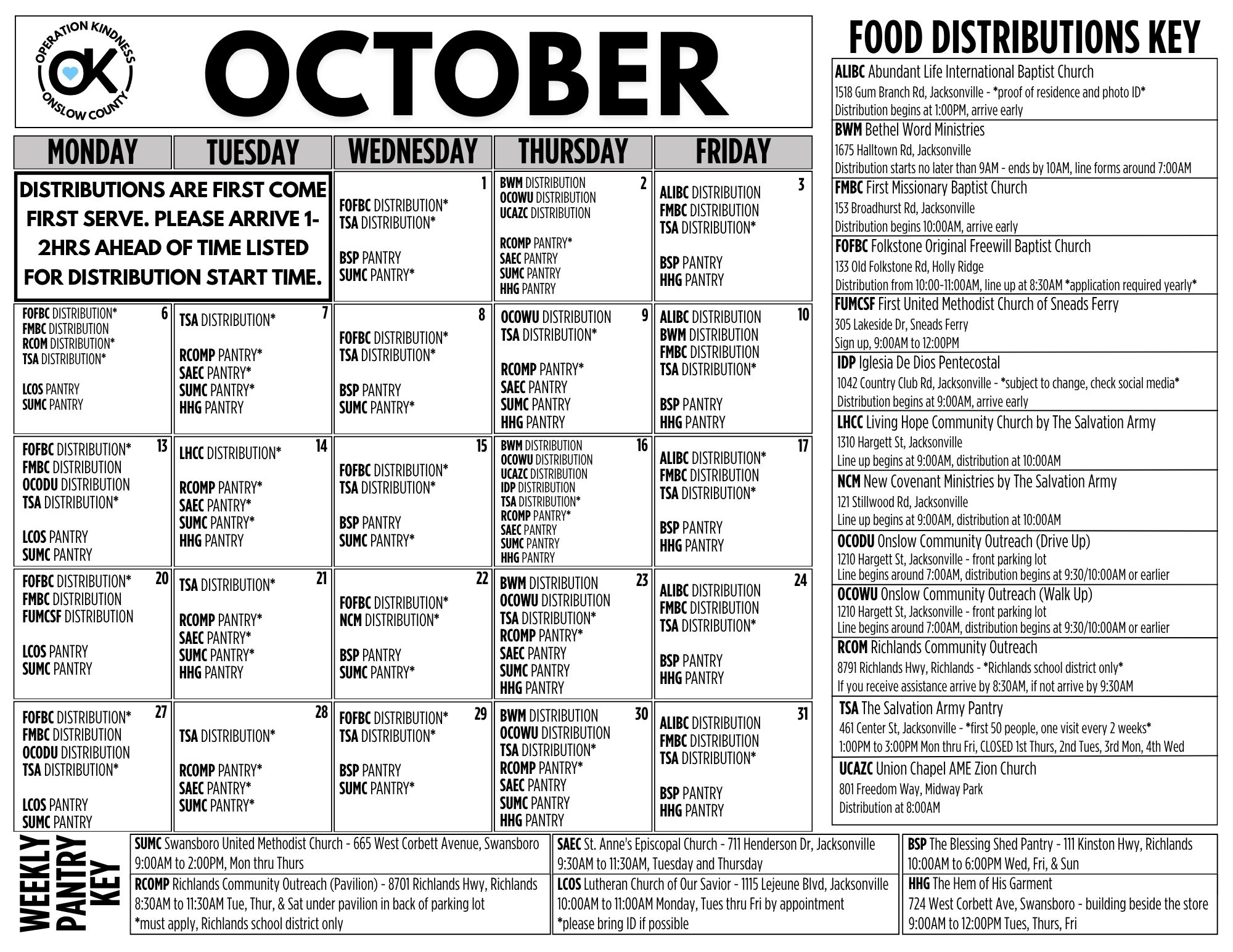Our friends at Operation Kindness, especially Kate Lynn, create a monthly calendar of all the different food distributions, free community pantries, and other resources available throughout Onslow County. We are proud to partner with them to share this fabulous guide to anyone who may be in need of a helping hand. As always, social media will still be the best place to find information in a constantly changing environment. Kate Lynn posts updates to the calendar daily in the Operation Kindness Facebook group.